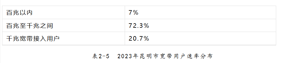 72.3%昆明市寬帶用戶接入速率百兆至千兆之間;千兆寬帶接入用戶占比為20.7%;速率在百兆以內(nèi)用戶為7%。