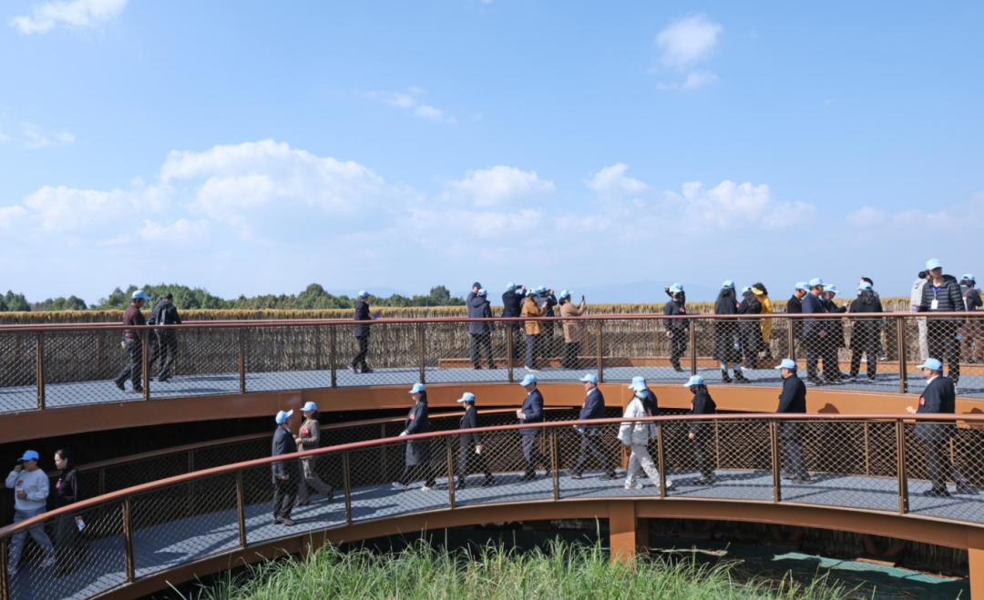 雖是冬日,但春城昆明依舊暖陽高照。行走在“草之橋”棧橋上,遠處濕地中連片的高大水杉紅若火焰,近處蘆葦叢仿佛金秋麥田,在藍天、白云的襯托下,好像置身于一幅美麗的畫卷中。代表們一邊認真聆聽講解員介紹滇池綠道建設情況,一邊拿著手機拍攝身邊的美景。