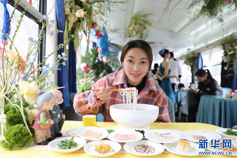 車廂內(nèi),云南青年表演民族山歌打跳,動(dòng)聽的山歌此起彼伏,讓旅客零距離感受云南山歌文化的獨(dú)特魅力;廚藝師傅邀請(qǐng)旅客共同制作鮮花過橋米線,品嘗鮮花餅和玫瑰花飲等美食,感知云南與花共生、以花為食的浪漫。