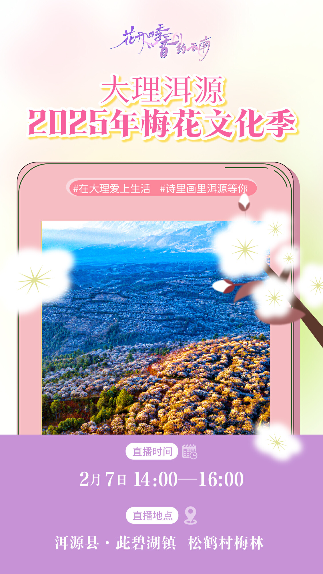 2月7日下午14:00—16:00,云新聞客戶端將攜手全國30余家主流媒體,全省100余家州市縣級融媒體中心,共同開啟《全國主流媒體聚合直播丨跨越山海的“梅”好之約!》大型直播活動。在省委網(wǎng)信辦的指導下,將通過聚合直播的方式,為大家?guī)碣p梅、詠梅、雕梅及走秀等精彩環(huán)節(jié),將洱源梅林的絕美風光呈現(xiàn)給遠方的你,邀請大家體驗一次穿越時空的梅花盛宴,一起感受到云南的“梅”好生活。
