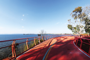 滇池綠道是一卷鋪展的風景長軸。13座“七彩云橋”如虹跨水,國內(nèi)首座多孔拱形鋼浮橋輕盈若蝶,17座“物語小橋”跨河連村,30余處觀景平臺匠心獨運,或懸挑臨波,或隱于林間。