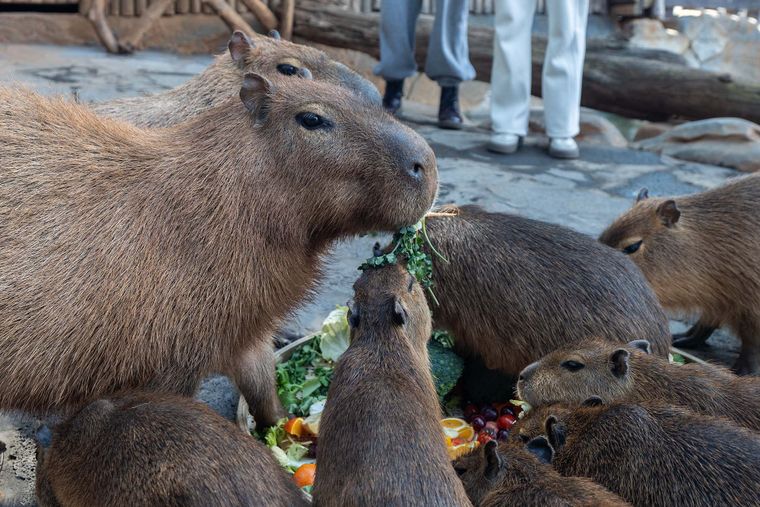 頂流網(wǎng)紅水豚家族也收到了工作人員為他們準(zhǔn)備的大份“元宵”盤,以白菜葉鋪底,放上蘋果、芹菜、香菜等它們喜歡的多種水果蔬菜,一家九口“豚”歡歡喜喜過元宵。