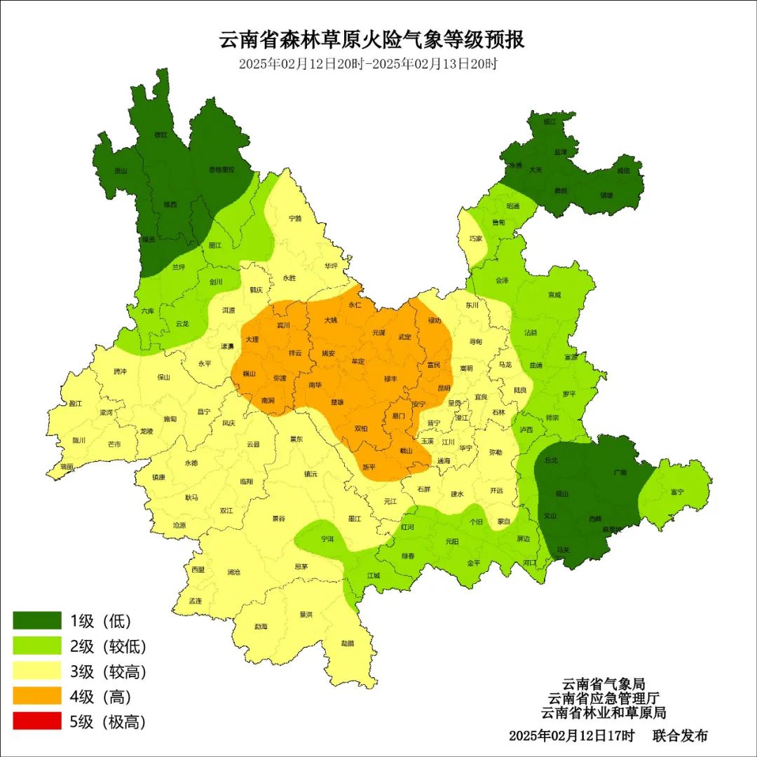 預(yù)計,楚雄州大部、大理州東部、昆明市西部和玉溪市中部4級,麗江市東部、大理州中部、保山市、德宏州、臨滄市、普洱市大部、西雙版納州、昆明市東部、玉溪市東部和南部、紅河州中部和曲靖市西部3級,其他地區(qū)1~2級。