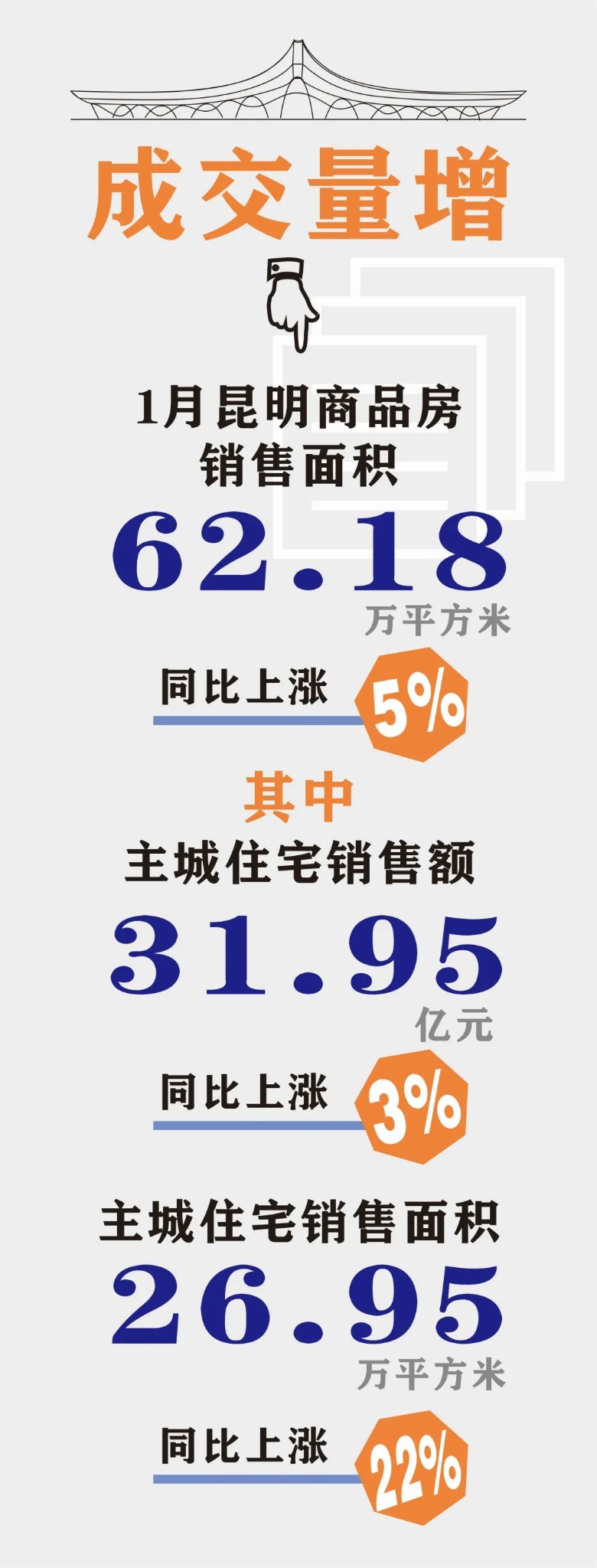 據(jù)昆明市地產(chǎn)開發(fā)與經(jīng)紀(jì)協(xié)會數(shù)據(jù),1月,昆明商品房銷售面積62.18萬平方米,同比上漲5%。其中,主城住宅銷售額31.95億元,同比上漲3%;主城住宅銷售面積26.95萬平方米,同比上漲22%。