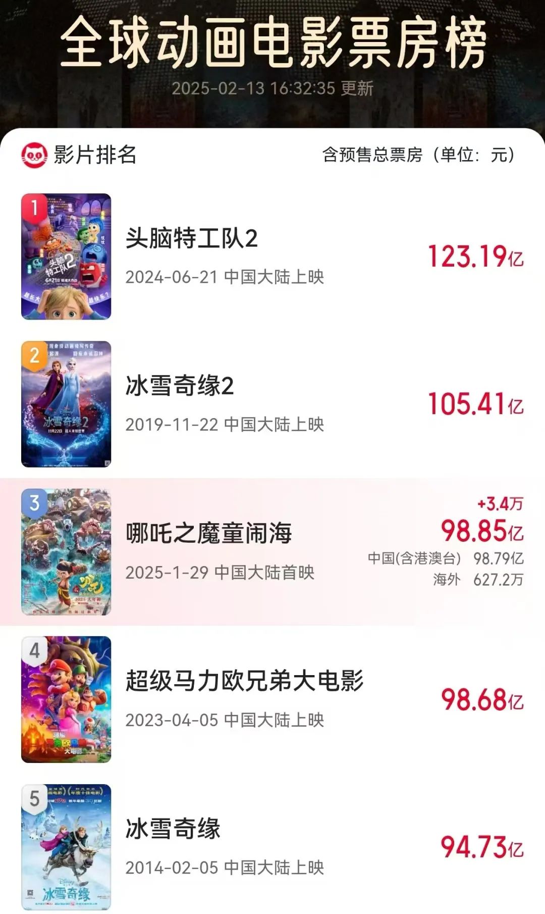 《哪吒2》進入全球動畫電影票房榜前三