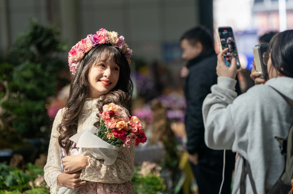 游客在斗南花卉市場游覽拍照。新華社記者陳欣波 攝
