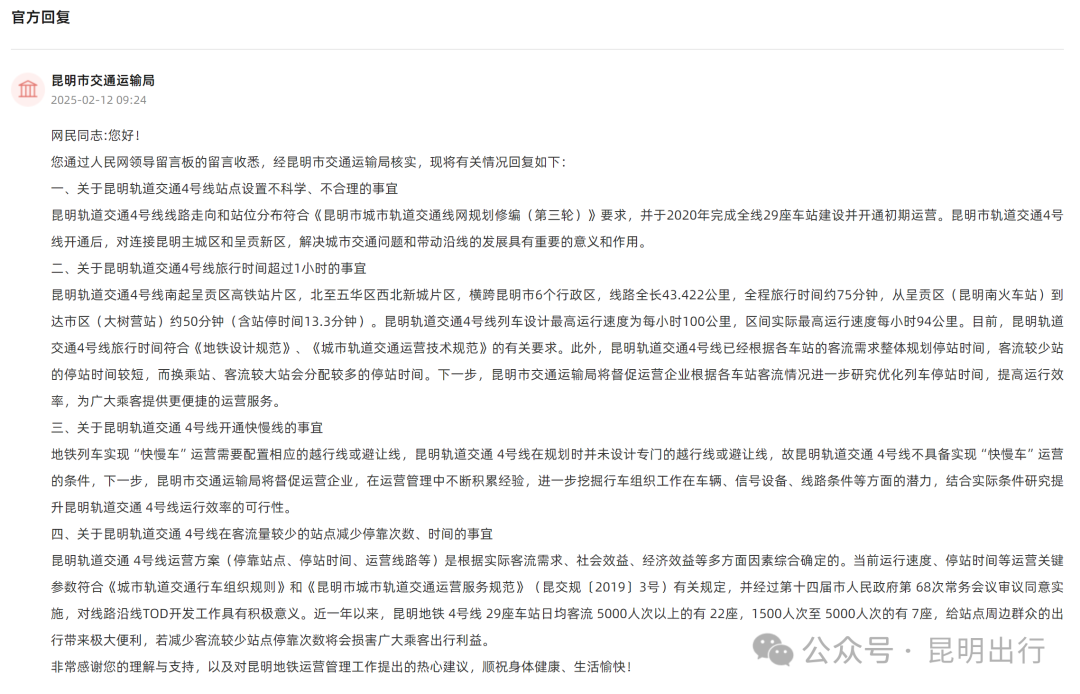 近日,有網(wǎng)友提出昆明地鐵4號線開行快慢線等建議,對此,昆明市交通運輸局于2月12日進(jìn)行了回復(fù),其中提到: