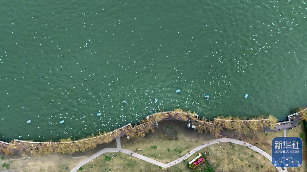 2月15日,市民游客在滇池邊喂紅嘴鷗(無人機照片)