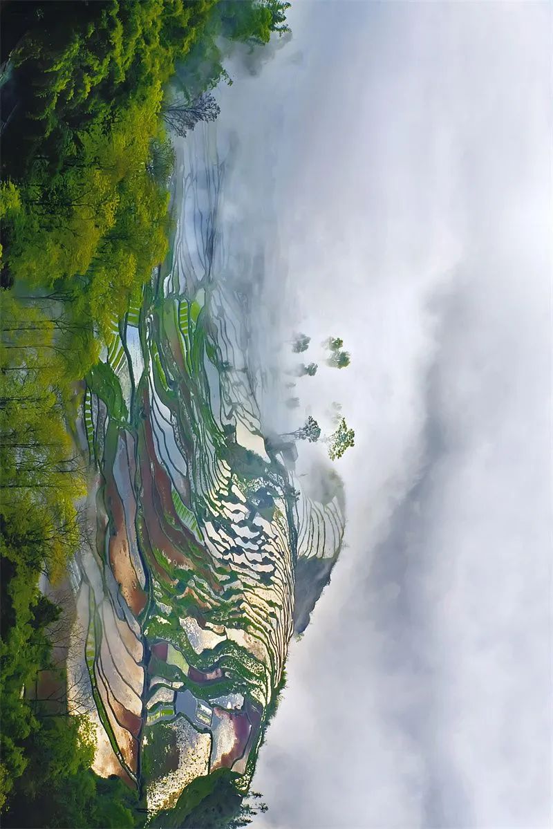 是春耕的哈尼梯田,斑斕色塊倒映出天空的綺麗,千年的大地史詩春意盎然。