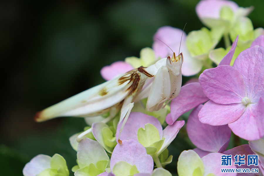 偽裝成花朵隱匿在石斛花間的蘭花螳螂(資料圖)。新華網(wǎng)發(fā)(馬麗芳 攝)
