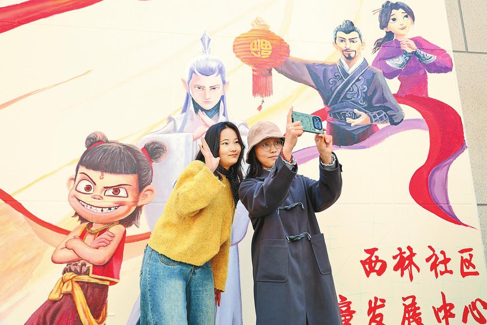 近日,昆明市盤龍區(qū)青云街道西林社區(qū)黨群服務中心外的巨幅《哪吒之魔童鬧?!分黝}墻繪吸引了不少市民前來拍照打卡。整組作品總面積約200平方米,生動再現(xiàn)了影片中的經(jīng)典場景與人物。西林社區(qū)黨委與青年藝術(shù)團隊合作,通過主題墻繪提升社區(qū)文化氛圍,傳遞影片中的正能量,吸引更多青年參與社區(qū)治理。(云南日報 記者胡妤雅/攝)