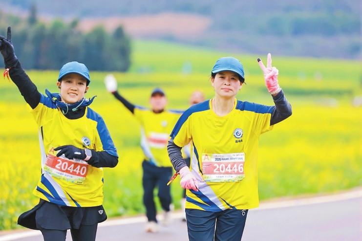 2月23日,2025曲靖羅平馬拉松舉行,15000名跑者在百萬畝油菜花田間暢快奔跑。