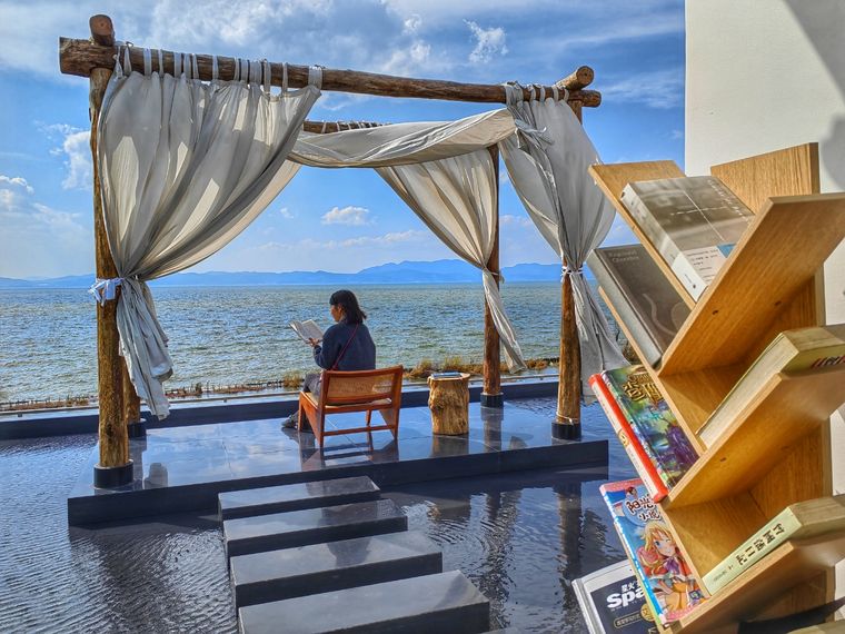 山隱·筑民宿位于海晏村,建筑設(shè)計(jì)簡約雅致,尤其是觀景房正對滇池,透過窗戶,滇池的柔美壯闊盡收眼底。民宿樓頂?shù)穆淙站坝^更是其一大亮點(diǎn),在這里可以欣賞到夕陽給天空染上橙紅、金黃交織的絢麗色彩,感受滇池在余暉映照下的波光粼粼。奔來書屋的加入,為山隱·筑民宿注入了文化氣息。
