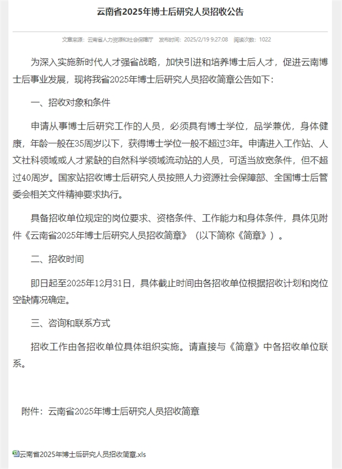 昆明信息港訊 記者江楓 近日,云南省人力資源和社會(huì)保障廳發(fā)布了云南省2025年博士后研究人員招收公告,計(jì)劃招收700余名博士后,涉及高原特色現(xiàn)代農(nóng)業(yè)、先進(jìn)制造業(yè)、綠色能源、新材料、生物醫(yī)藥、數(shù)字經(jīng)濟(jì)、煙草、電力等行業(yè)領(lǐng)域。