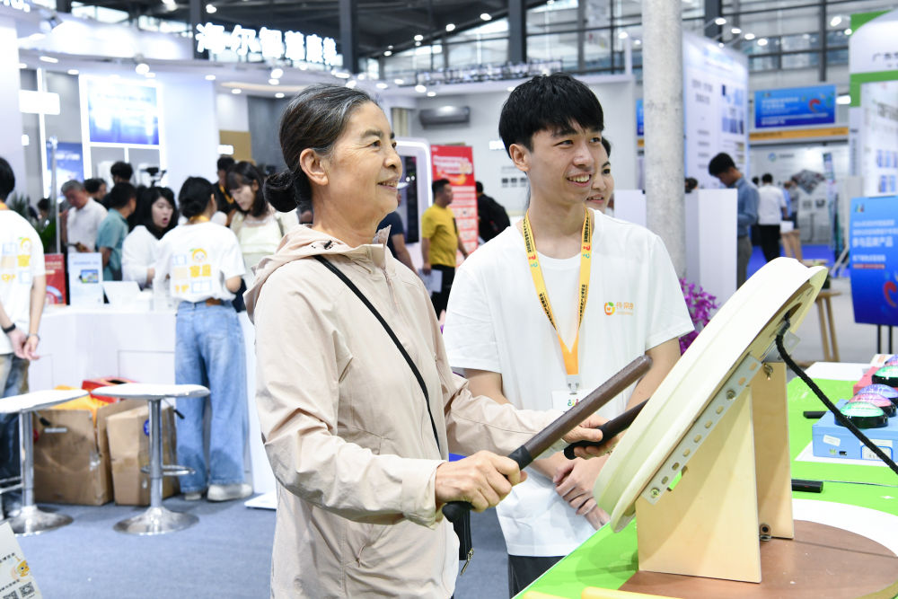 2024年10月27日,老人在2024深圳國際智慧養(yǎng)老產(chǎn)業(yè)博覽會上體驗(yàn)樂齡鼓。新華社記者 梁旭 攝