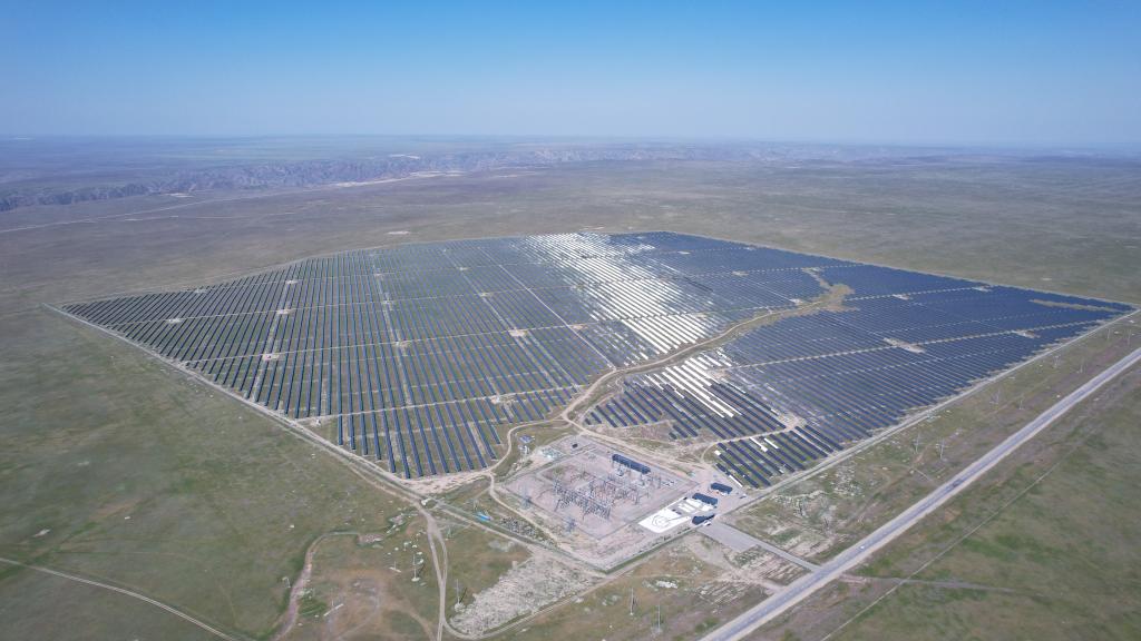 這是2023年5月4日在哈薩克斯坦阿拉木圖州拍攝的卡普恰蓋100兆瓦光伏電站(無人機照片)。這是哈薩克斯坦單體最大的光伏發(fā)電項目之一,也是中哈綠色能源合作項目之一,由中國企業(yè)寰泰能源與哈薩克斯坦合作伙伴投資建設(shè)。新華社發(fā)(奧斯帕諾夫攝)