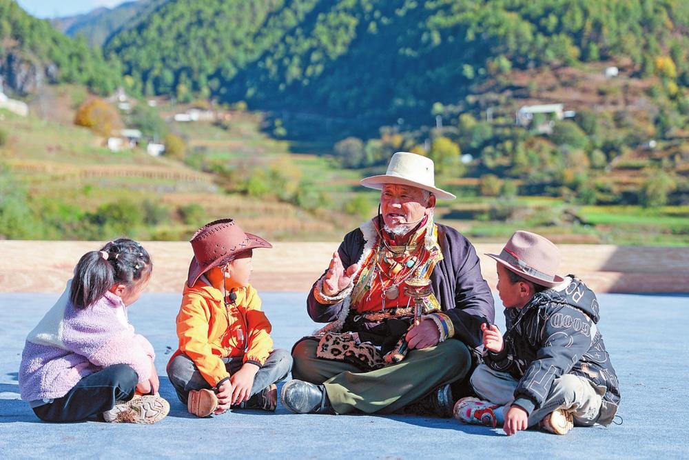 在香格里拉尼汝村,藏族爺爺給兒童講民族團(tuán)結(jié)的故事。記者胡妤雅 攝
