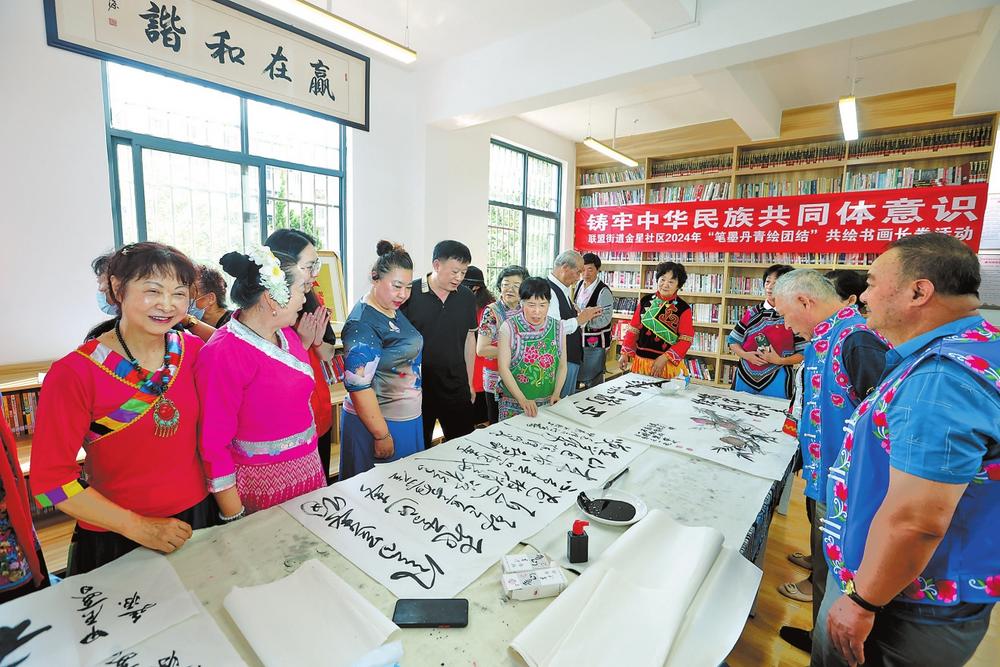 昆明市金星社區(qū)舉辦“筆墨丹青繪團(tuán)結(jié)”主題書(shū)畫(huà)展。記者陳飛 攝