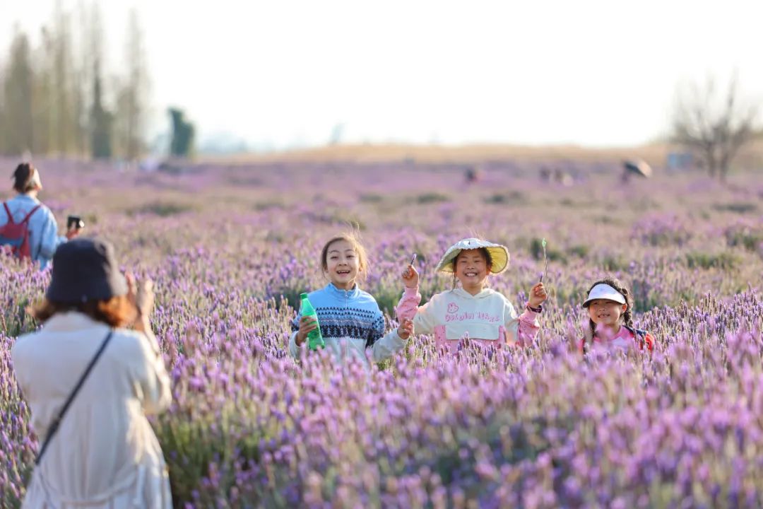 孩子們在滇池綠道呈貢段薰衣草花海里拍照。胡妤雅 攝