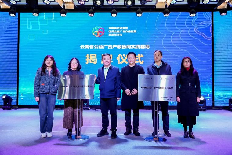 現(xiàn)場舉行了“云南省公益廣告產(chǎn)教協(xié)同實踐基地”揭牌儀式。省市場監(jiān)管局、昆明國家廣告產(chǎn)業(yè)園、云南民族大學、昆明城市學院共同為基地揭牌,標志著云南公益廣告產(chǎn)教融合步入深化發(fā)展新階段,為公益廣告創(chuàng)作注入產(chǎn)學研協(xié)同動能。
