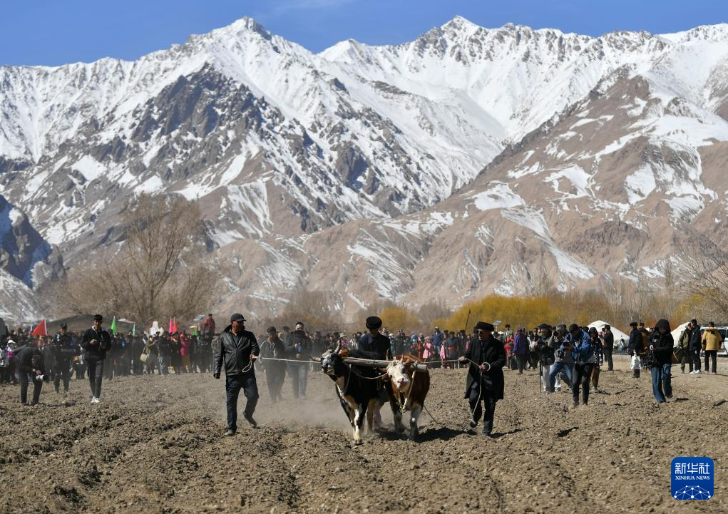 在新疆塔什庫(kù)爾干塔吉克自治縣“彩云人家”民俗村,村民為游客表演傳統(tǒng)農(nóng)業(yè)生產(chǎn)中的犁地方式——“二牛抬杠”(3月22日攝)。