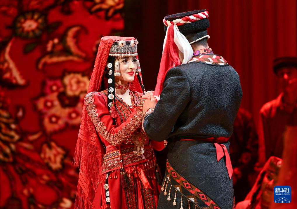 演員在新疆塔什庫(kù)爾干塔吉克自治縣蔥嶺演藝中心表演國(guó)家級(jí)非物質(zhì)文化遺產(chǎn)——塔吉克族婚俗(3月22日攝)。