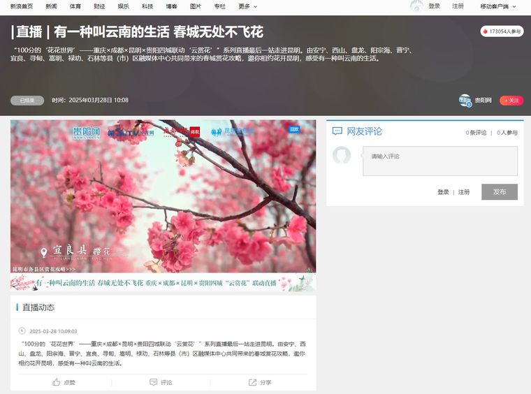 昆明信息港訊 記者楊炎 馮垚 3月28日上午10時, “100分的‘花花世界’——重慶×成都×昆明×貴陽四城聯(lián)動‘云賞花’” 系列直播最后一站來到昆明,昆明信息港全媒體平臺以及重慶、成都、貴陽主流媒體同步直播,春城無處不飛花的景象吸引了大量網(wǎng)民點贊。