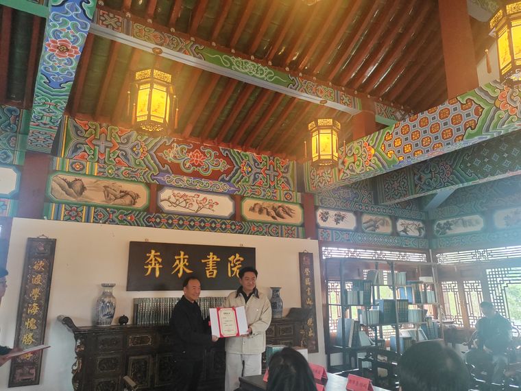 度假區(qū)黨工委副書記熊堅為大象書店主理人楊雄授予捐贈證書。
