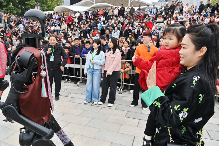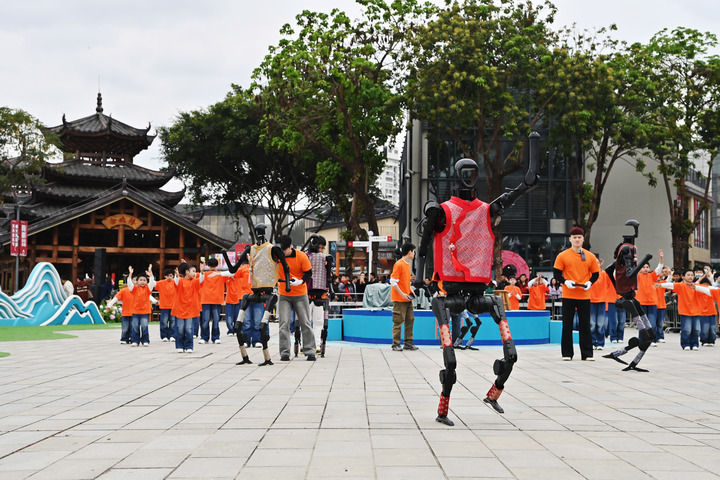 開幕式上,“科技范兒”成為關(guān)鍵詞。除了機(jī)器人“劉三姐”,在蛇年春晚上手持花絹扭秧歌“出圈”的同款人形機(jī)器人也來到廣西,脫下花棉襖,穿上壯錦馬甲,和街舞少年們共舞。
