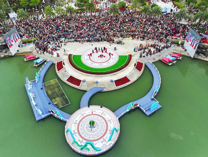 在南寧舉行的“廣西三月三·八桂嘉年華”開幕式現(xiàn)場(3月31日攝,無人機(jī)照片)。新華社記者 周華 攝