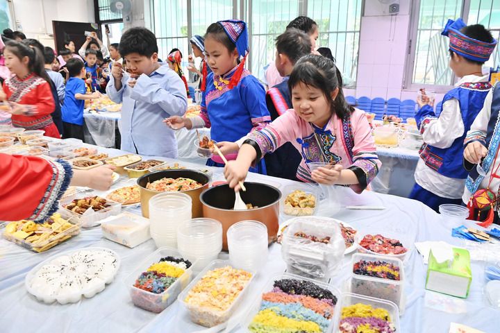 孩子們在廣西南寧市民族大道東段小學(xué)品嘗美食(3月27日攝)。新華社記者 周華 攝