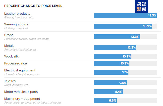 據(jù)耶魯大學(xué)預(yù)算實(shí)驗(yàn)室預(yù)測,皮革制品、衣服、農(nóng)作物、金屬、羊毛等類別產(chǎn)品價格漲幅將超過10%。