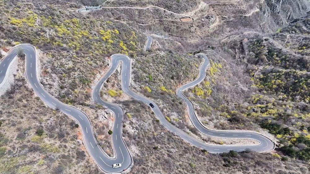 在河南新鄉(xiāng)衛(wèi)輝市,一條條便捷的公路串聯(lián)起山間美景,游客在花海中感受美麗春天。