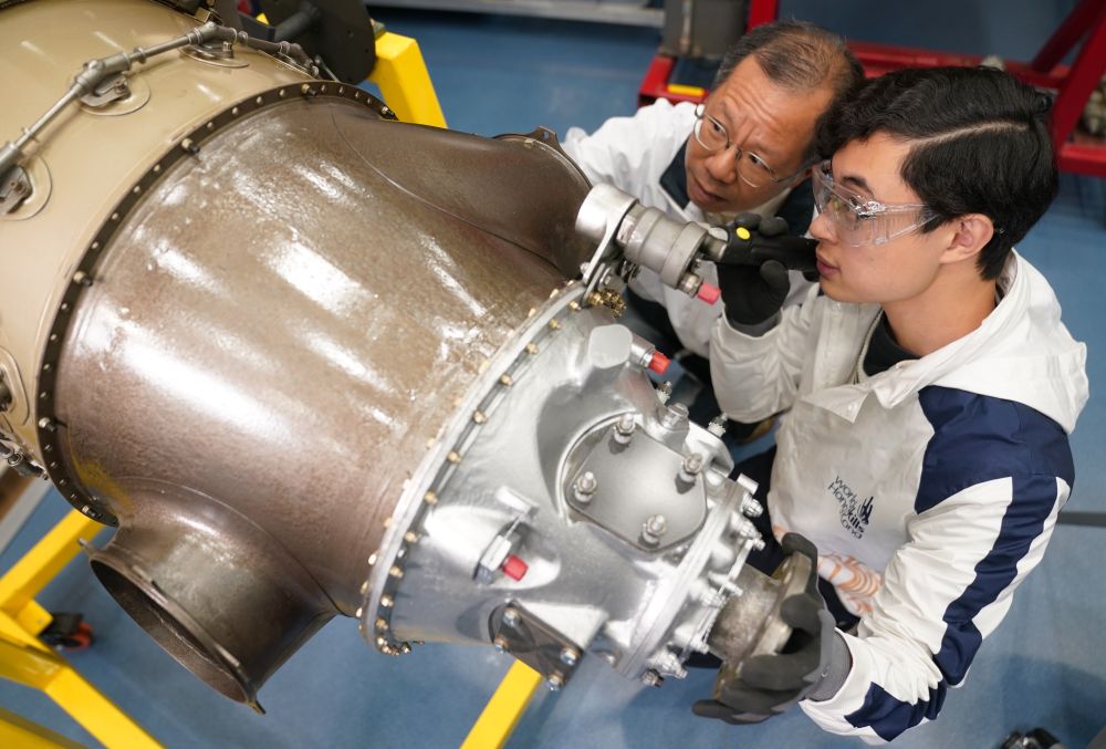 在香港專業(yè)教育學(xué)院,黃富東(右)在檢查渦輪螺旋槳飛機引擎(1月14日攝)。新華社發(fā)(王申攝)