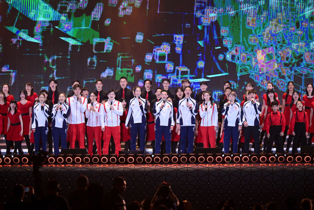 3月1日,在香港啟德體育園開幕典禮上,內地與香港運動員代表合唱歌曲。新華社記者 朱煒 攝