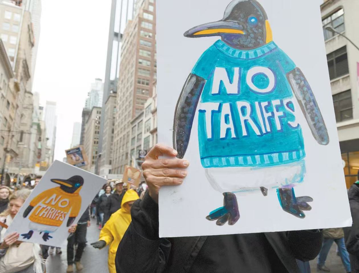 5日,美國多地舉行反對特朗普政府的抗議活動。圖為紐約抗議者手舉一幅畫有企鵝形象的牌子,反對美國政府的關(guān)稅政策。2日,美國總統(tǒng)特朗普宣布對貿(mào)易伙伴開征“對等關(guān)稅”,就連印度洋上“擠滿了海豹以及企鵝和其他鳥類”的無人島也被納入征稅范圍。 (IC photo)
