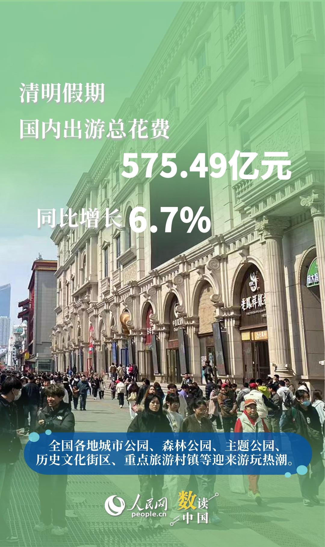 經(jīng)文化和旅游部數(shù)據(jù)中心測(cè)算,清明節(jié)假期3天,國(guó)內(nèi)出游總花費(fèi)575.49億元,同比增長(zhǎng)6.7%。