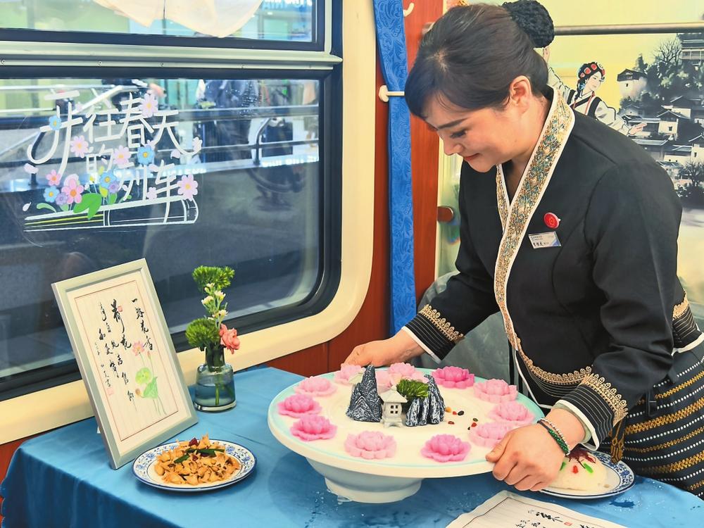 據(jù)了解,該列車用山茶花、格桑花等7種代表性花卉裝飾車廂,每個車廂都擁有獨特的花卉主題和裝飾風格。列車為旅客提供了豐富的文化體驗服務(wù),旅客可以品嘗到由云南鮮花制成的鮮花餅等美食,列車還設(shè)置了花藝臺,讓旅客可以體驗插花的樂趣。同時,推出“云花伴旅”文化體驗服務(wù),旅客可以在乘務(wù)員的幫助下編制花卉頭繩,或在“昆鐵+”小程序上下單購買云南的花卉產(chǎn)品。