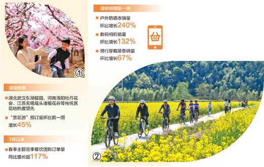 攜程數(shù)據(jù)表明,清明假期“賞花游”預(yù)訂量環(huán)比前一周增長(zhǎng)45%,林芝桃花節(jié)、天津海棠花節(jié)等活動(dòng)拉動(dòng)當(dāng)?shù)厮阉鳠岫葘?shí)現(xiàn)環(huán)比兩位數(shù)增長(zhǎng)。據(jù)同程旅行相關(guān)統(tǒng)計(jì),清明假期擁有櫻花、牡丹、桃花等熱門花卉的傳統(tǒng)目的地出游熱度明顯上升。另?yè)?jù)途牛旅游發(fā)布的數(shù)據(jù),清明假期“貴州百里杜鵑—黃果樹(shù)—荔波—西江6日游”“武漢3日踏春游”等包含踏春賞花體驗(yàn)的旅游產(chǎn)品人氣較高。