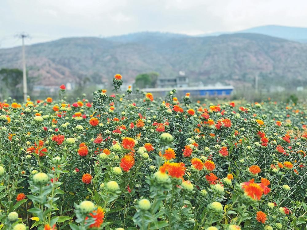 示范區(qū)位于彌渡縣苴力鎮(zhèn)先鋒村委會(huì)密大村,示范面積為1050畝。示范區(qū)采用高產(chǎn)、優(yōu)質(zhì)的紅花新品種“云紅七號(hào)”,集成配套以“標(biāo)準(zhǔn)化、規(guī)范化、苗期打頂”為核心的高產(chǎn)栽培技術(shù)。紅花畝產(chǎn)量比傳統(tǒng)種植方法增產(chǎn)5%以上,種植成本減少一半,種植管理過(guò)程中勞動(dòng)力成本減少了四分之三,有效降低了病害的發(fā)生率和花瓣農(nóng)藥殘留。