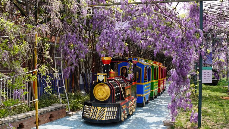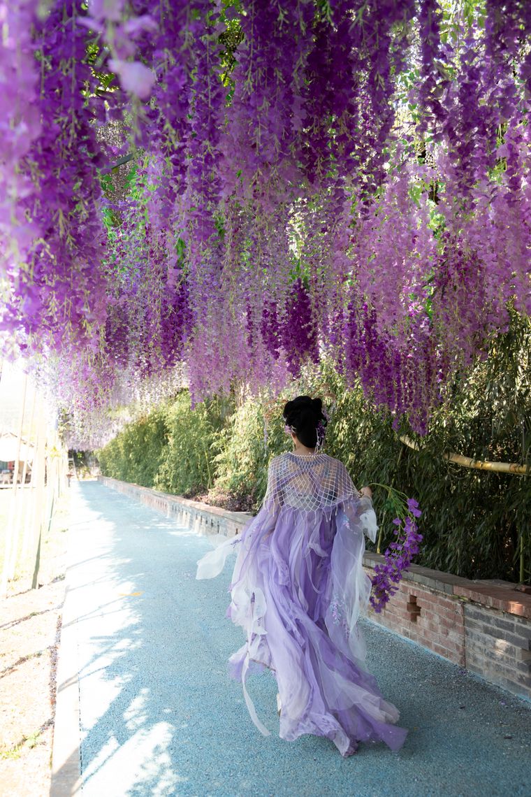 為豐富游客體驗,景區(qū)推出“紫藤花下 漢服雅集”“穿越紫色星?!毕盗兄黝}活動。游客可身著漢服漫步花廊,參與古風秘境攝影、花間長廊漫步,感受傳統(tǒng)文化魅力,也可以跳上網(wǎng)紅小火車,穿梭于藤蔓垂落的夢幻光影間,花瓣隨風輕吻發(fā)梢,仿佛闖入一場流動的紫色夢境。
