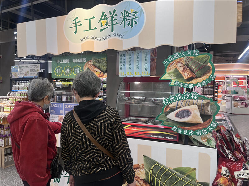 上午11點(diǎn),零零星星的顧客在盒馬鮮生(順城購(gòu)物中心店)購(gòu)物,超市中間設(shè)置了一個(gè)醒目的貨架,上面擺放著多個(gè)口味的粽子,醬香黑豬肉、經(jīng)典洗沙、經(jīng)典白米、蛋黃鮮肉粽等,價(jià)格16元-21元一袋。一旁的冰柜里還有散裝粽子,蜜棗赤豆粽130克一個(gè)5.9元,洗沙粽130克一個(gè)6.9元。不少經(jīng)過(guò)的顧客會(huì)湊近看看,但購(gòu)買(mǎi)的很少。