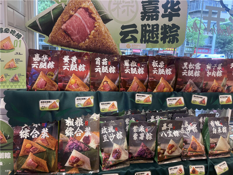 此外,在面包店也能發(fā)現(xiàn)粽子的身影。走進(jìn)嘉華餅屋(白馬小區(qū)店),其中一個(gè)貨架專(zhuān)門(mén)擺放粽子,黑松露云腿、梅干菜扣肉、藤椒云腿粽……口味琳瑯滿目。工作人員介紹,4月初店里就推出了“嘗鮮”裝的粽子,一袋只有一枚,近期開(kāi)始售賣(mài)常規(guī)款?!敖衲晡覀兊男缕酚邪酌佐蘸完惼ざ股臭?,其他的都是老口味。目前購(gòu)買(mǎi)的顧客不多,節(jié)前一周才會(huì)迎來(lái)銷(xiāo)量小高峰?!?/p>