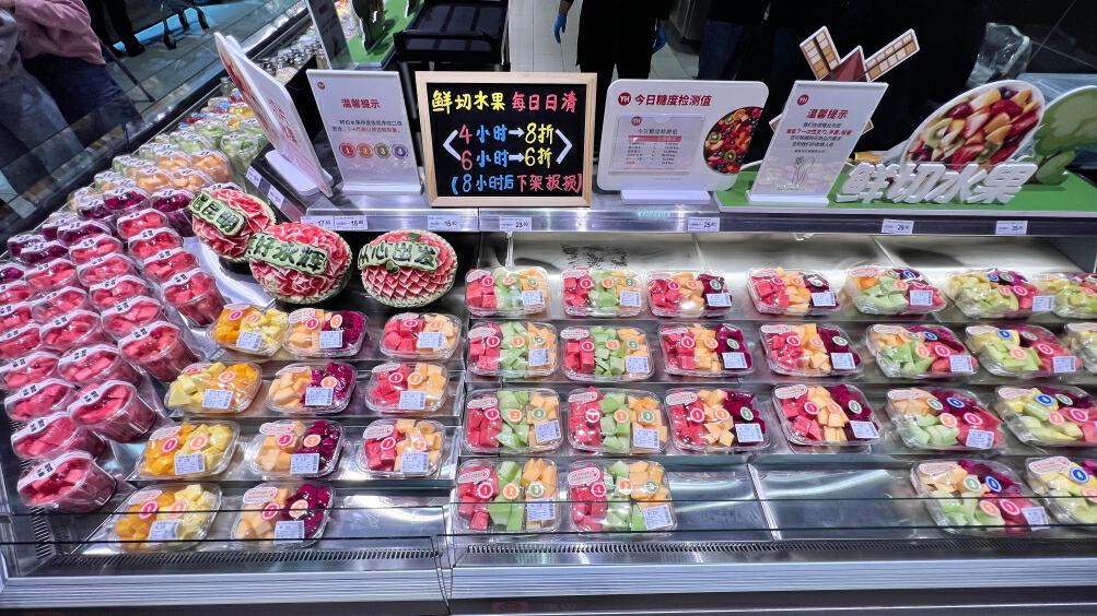 在現(xiàn)切水果區(qū)買完水果可以免費(fèi)幫清洗、現(xiàn)切。此外,鮮切水果從切分完成開始計(jì)時(shí),超過(guò)4小時(shí)打8折,超過(guò)6小時(shí)打6折,超過(guò)8小時(shí)立即下架處理。水果果切還根據(jù)甜度做編號(hào),做品嘗先后順序推薦,避免口味不佳。