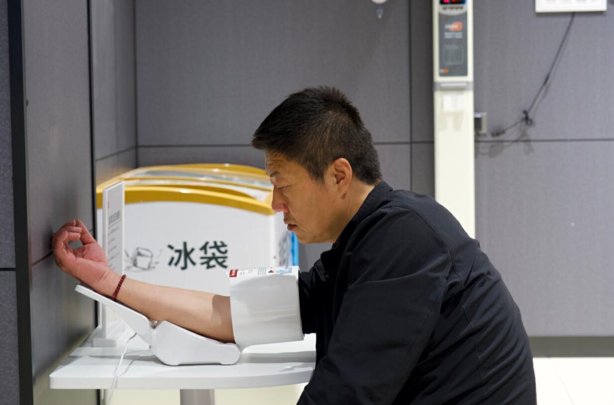 在顧客休息區(qū),身高測(cè)量?jī)x、醫(yī)療箱、血壓計(jì)、老花鏡、輪椅等設(shè)備一應(yīng)俱全,更有自助取冰、直飲水、微波爐、充電寶等方便顧客購(gòu)買商品后隨時(shí)使用?!绑w驗(yàn)感很好,免費(fèi)幫洗切水果、微波爐、自助取冰、前1小時(shí)免費(fèi)充電的充電寶,每一樣都是我在購(gòu)物時(shí)需要的?!笔忻駰钕壬f(shuō)。