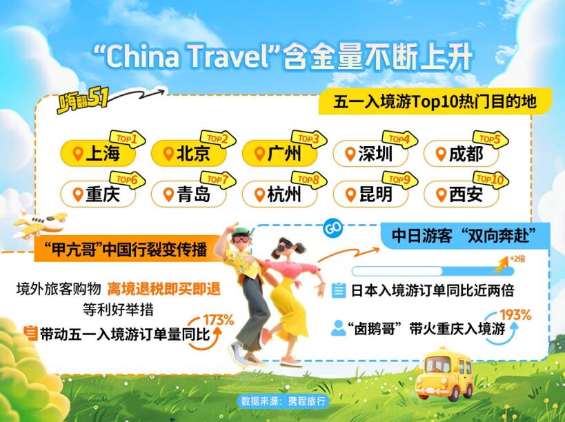 近期,網(wǎng)紅博主“甲亢哥”《中國(guó)奇遇記》系列短視頻在海外社媒實(shí)現(xiàn)裂變式傳播,入境游在現(xiàn)象級(jí)傳播效應(yīng)下迎來(lái)爆發(fā)增長(zhǎng),五一期間入境酒店搜索指數(shù)同比激增200%,入境游訂單量同比去年增長(zhǎng)173%。其中,上海、北京、廣州、深圳、成都、重慶、青島、杭州、昆明和西安入圍五一入境游Top10熱門(mén)目的地。韓國(guó)、日本、新加坡、俄羅斯、馬來(lái)西亞、泰國(guó)、美國(guó)、澳大利亞、英國(guó)和越南入圍入境游Top10客源國(guó)。