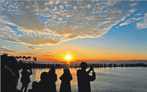 在絢爛的晚霞里,海晏村靜靜地佇立著。這個有600多年歷史的云南古漁村,以其獨特的地理位置,成為觀賞滇池落日的絕佳之地。站在海晏村的古碼頭遺址望去,霞光映照下的粼粼湖面泛著金光,幾只水鳥掠過水天相接處,定格了一幅“落日熔金,暮云合璧”的動人畫卷。此刻,游人如織,共賞這浪漫的美景。