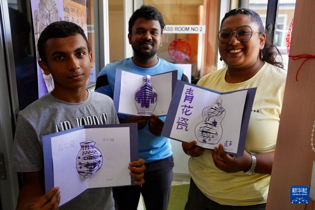 在學習制作青花瓷賀卡的課堂上,21歲的阿基拉·恰米卡拉一邊描畫青花瓷瓶身的弧線,一邊將斯里蘭卡大象與中國傳統(tǒng)紋樣填入其中,沿著畫紙細細裁剪幾道,便制成一張立體賀卡?!拔液芟矚g中國文化,我想在作品中將中國文化與斯里蘭卡本土文化相融合?!彼f。