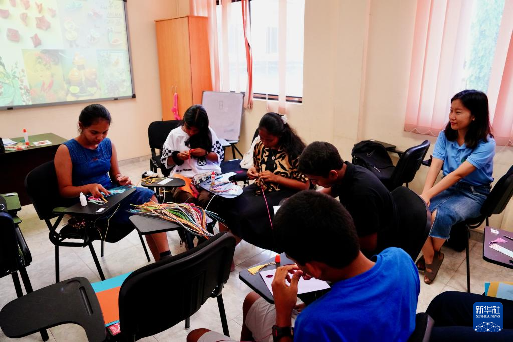 4月19日,在斯里蘭卡首都科倫坡舉行的聯(lián)合國中文日活動上,蘭比尼孔子課堂的學生學習制作衍紙書簽。新華社記者 伍岳 攝