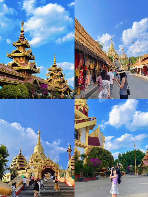 身穿傣族和東南亞風格服飾的游客穿梭其中